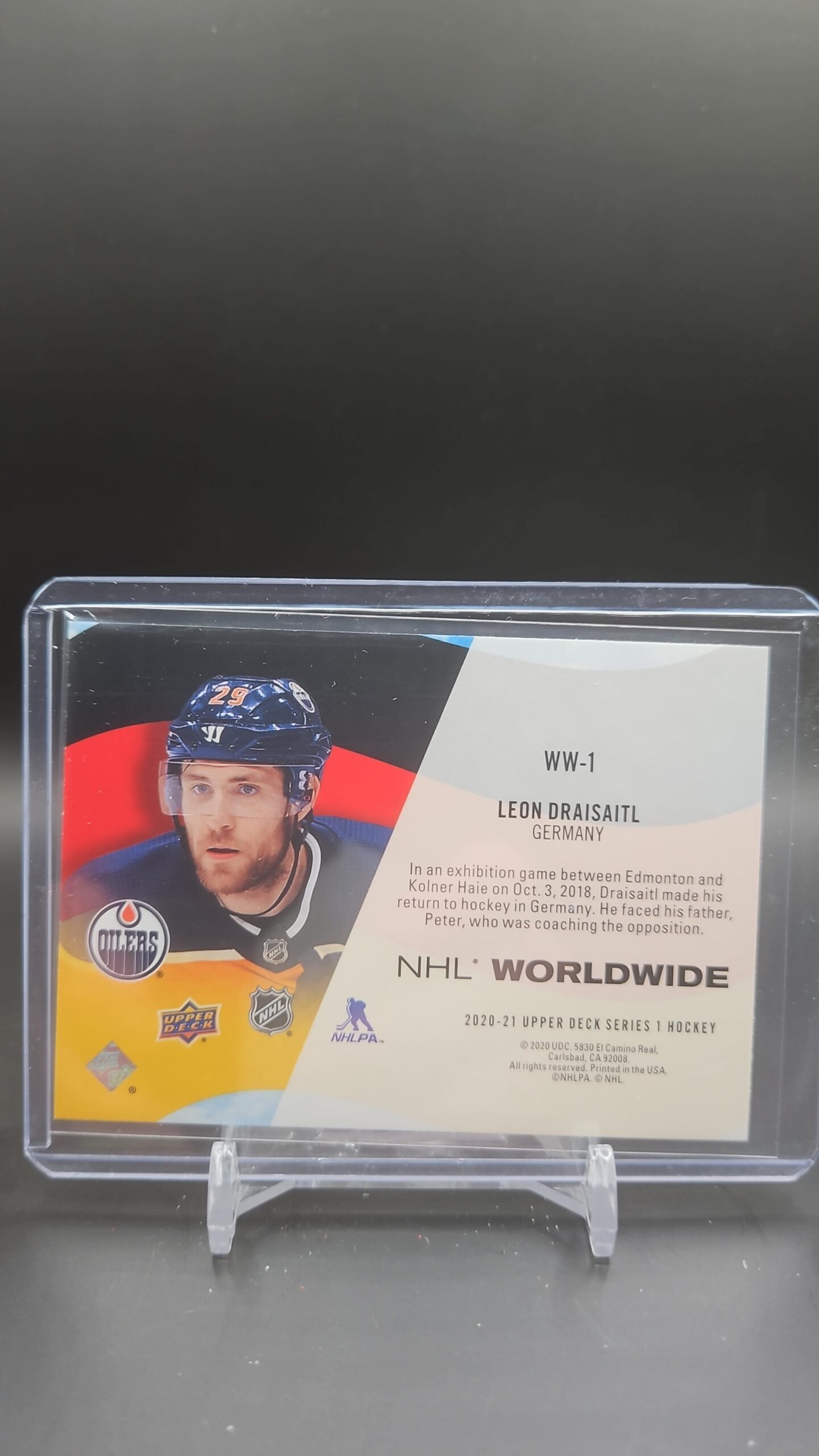 Leon Draisaitl’s 2020-21 Upper Deck Series 1 NHL Worldwide #WW-1—dynamic insert card for Oilers and international hockey fans.