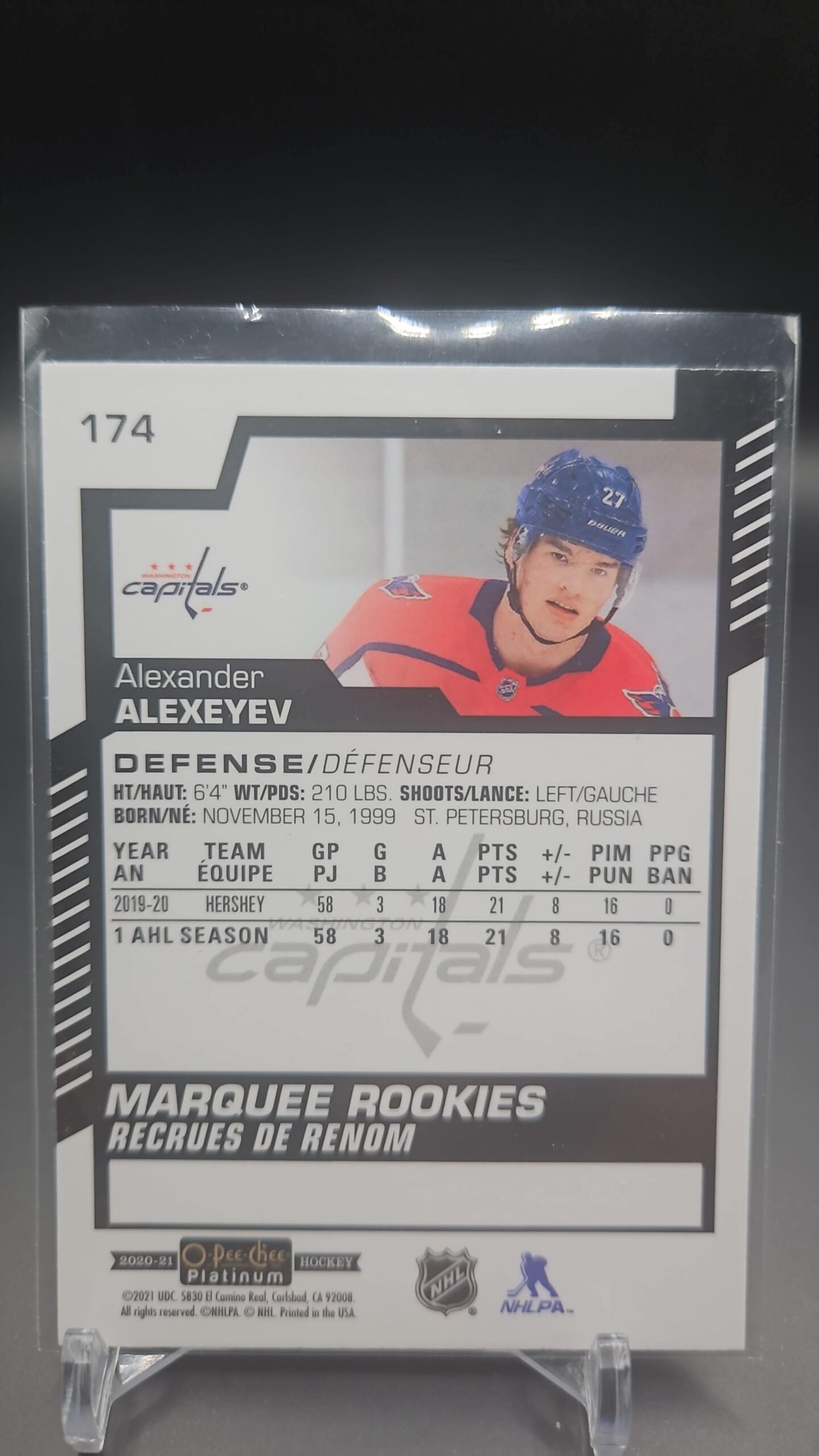 Authentic 2020-21 O-Pee-Chee Platinum Marquee Rookies #174 Alexander Alexeyev card featuring the Washington Capitals rookie. A must-have NHL collectible insert.