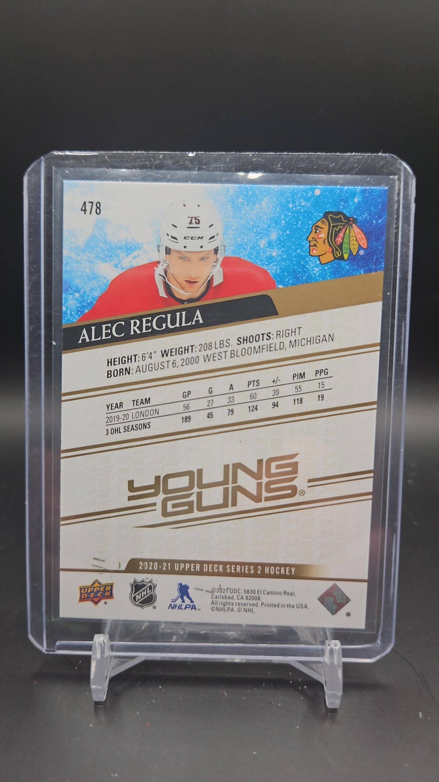 This Young Guns Speckled Rainbow Foil #478 Alec Regula rookie card from 2020-21 Upper Deck Series 2 is a rare and must-have piece for Chicago Blackhawks and NHL rookie card collectors.