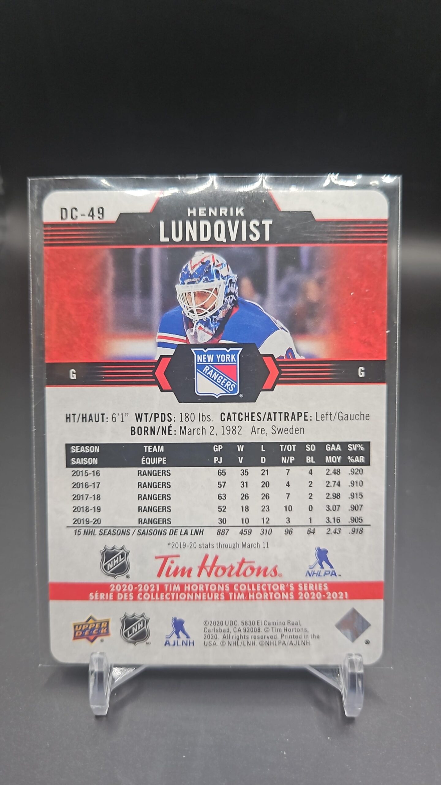 2020-21 Upper Deck Tim Hortons Red Die Cut Henrik Lundqvist #DC-49 is a top collectible for New York Rangers fans and hockey card collectors.