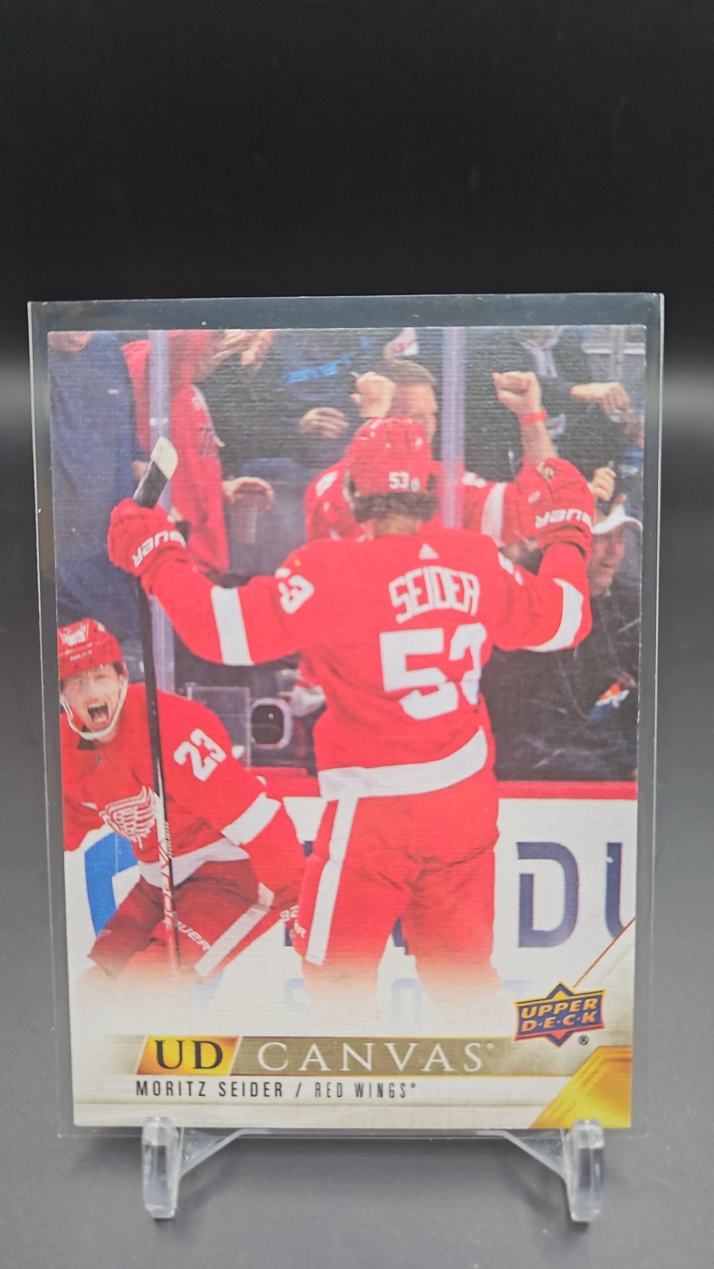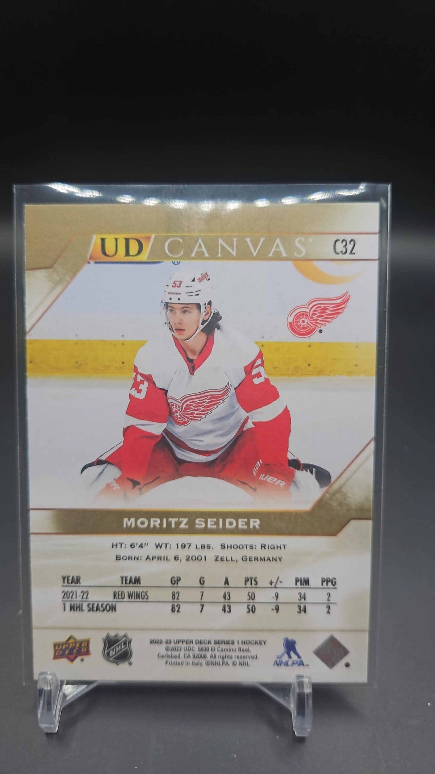 2022-23 Upper Deck Series 1 UD Canvas Moritz Seider #C32 Detroit Red Wings rookie card is a top collectible for hockey fans and rookie card enthusiasts.