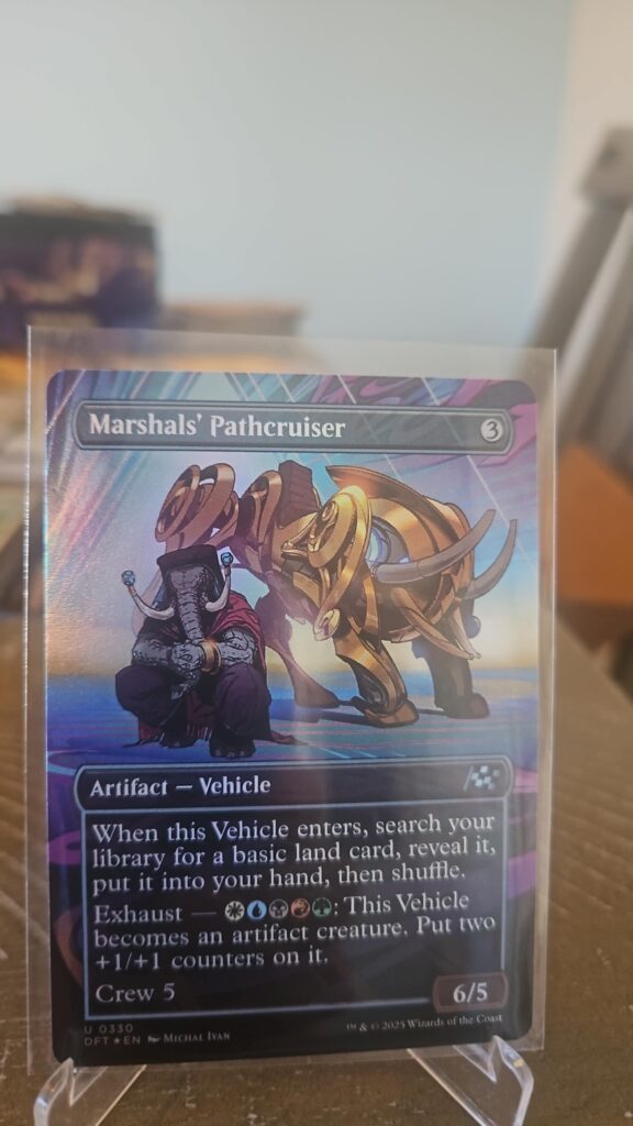 Don’t miss your chance to own Marshal’s Pathecruiser (Borderless) from Aetherdrift—add this visually stunning vehicle card to your Magic: The Gathering collection today!