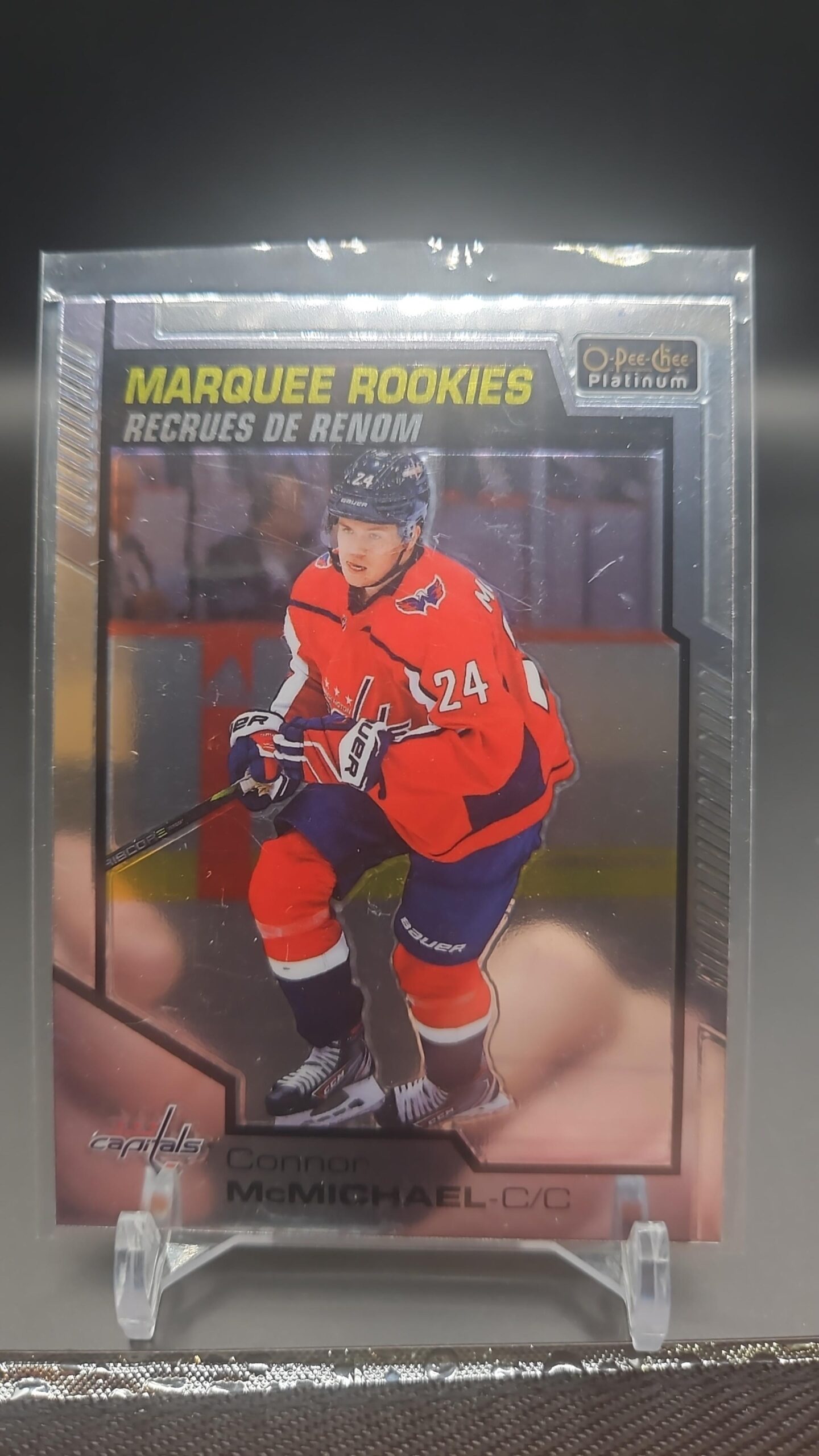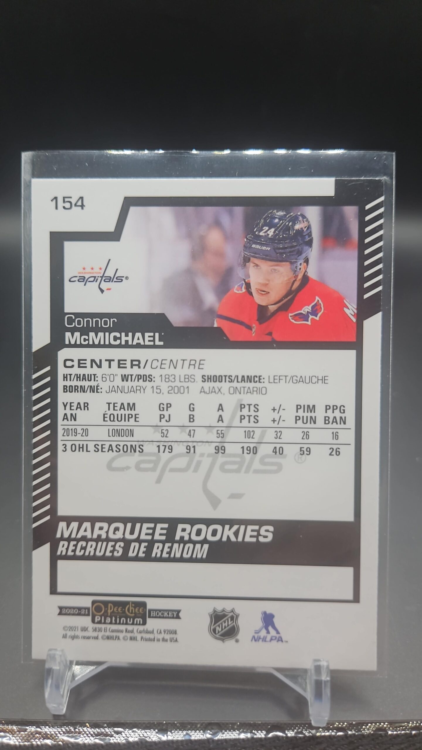 The 2020-21 O-Pee-Chee Platinum Marquee Rookies #154 Connor McMichael rookie card is a highly sought-after insert, showcasing the Washington Capitals’ top prospect. Its chromium finish and Marquee Rookies branding make it a staple for rookie collectors and set builders.