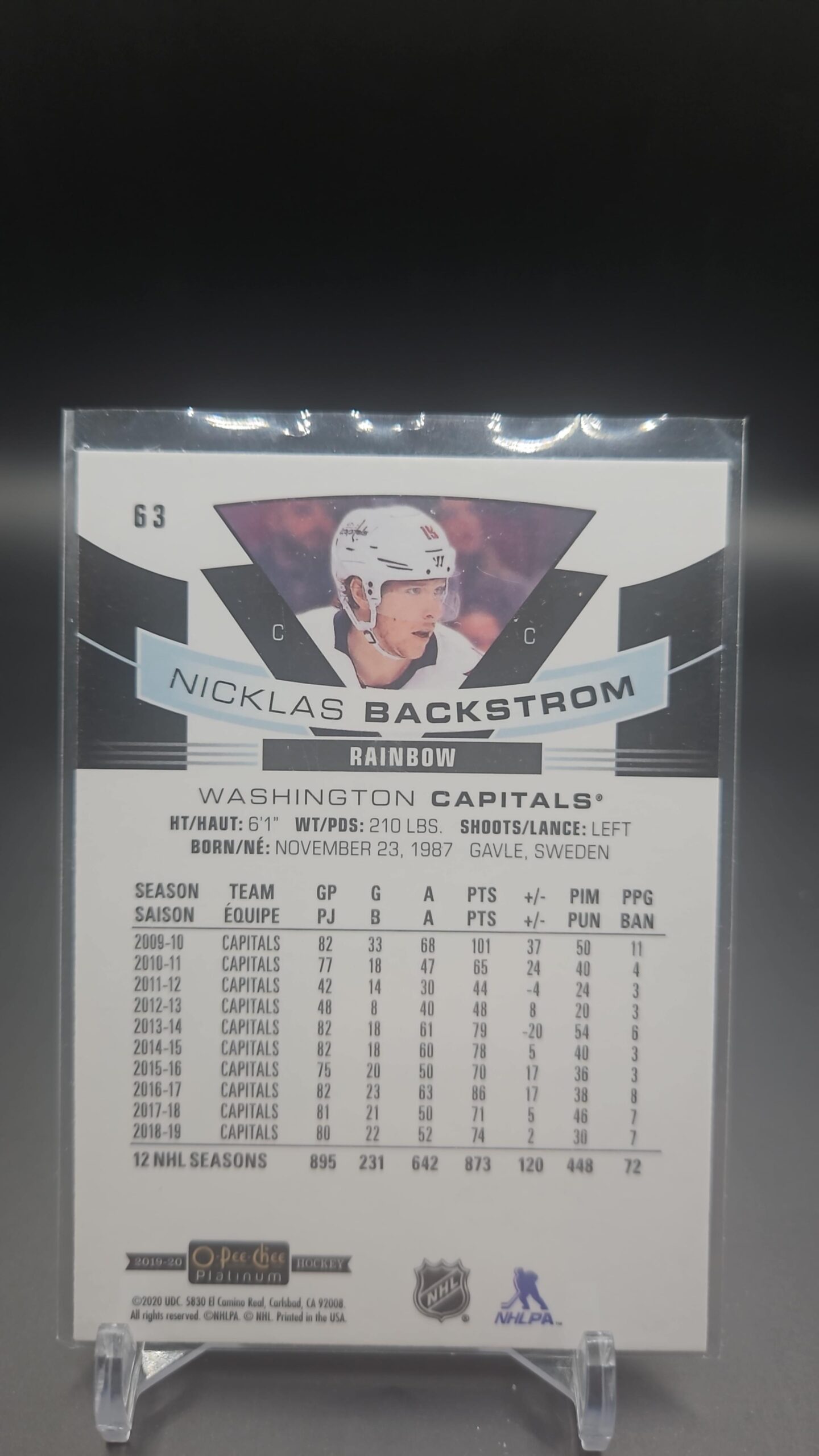 Authentic 2019-20 O-Pee-Chee Platinum Rainbow #63 Nicklas Backstrom card featuring the Washington Capitals star. A must-have NHL collectible Rainbow parallel insert.