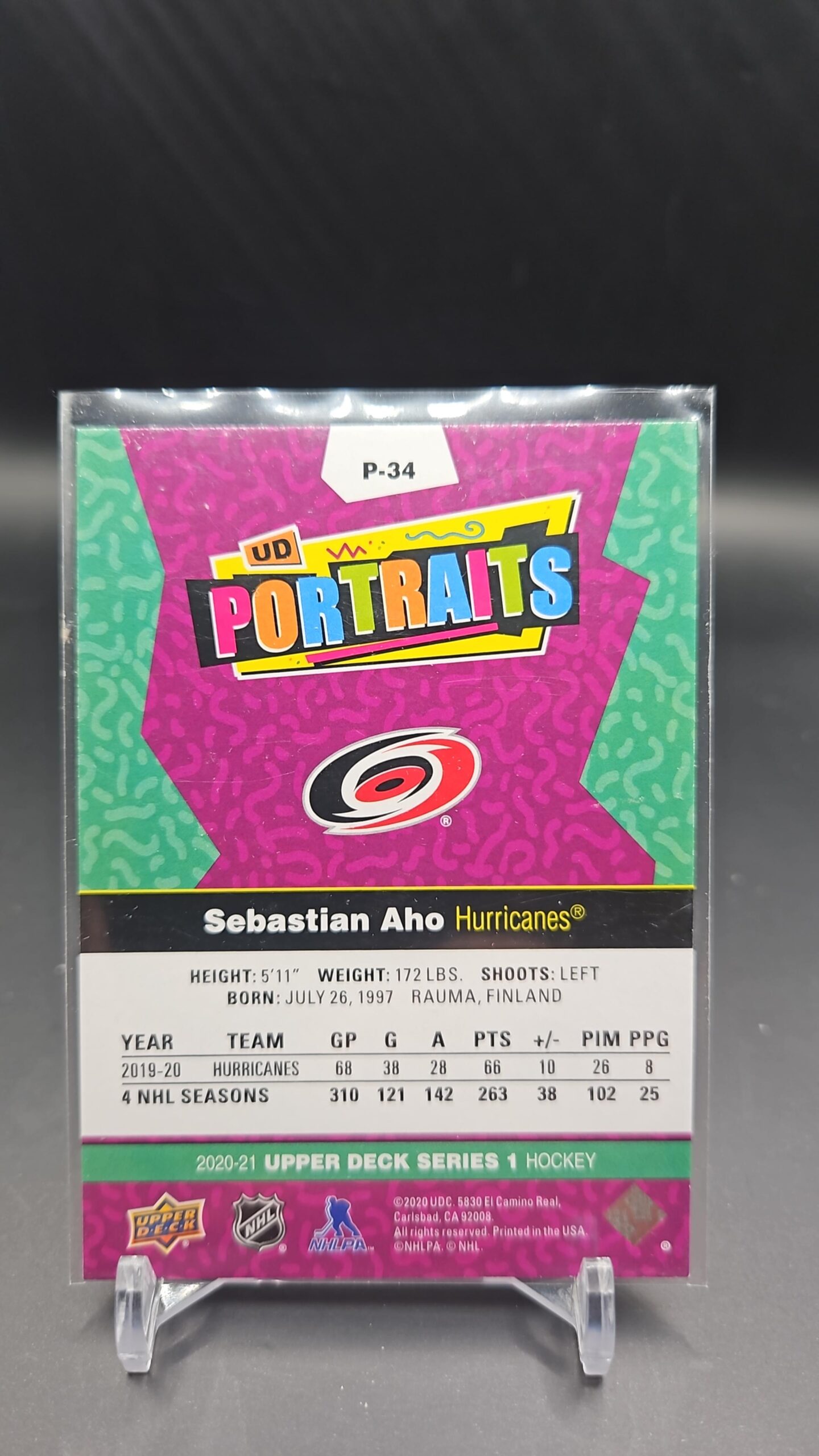 2020-21 Upper Deck Series 1 UD Portraits #P-34 Sebastian Aho Carolina Hurricanes NHL collectible insert card.