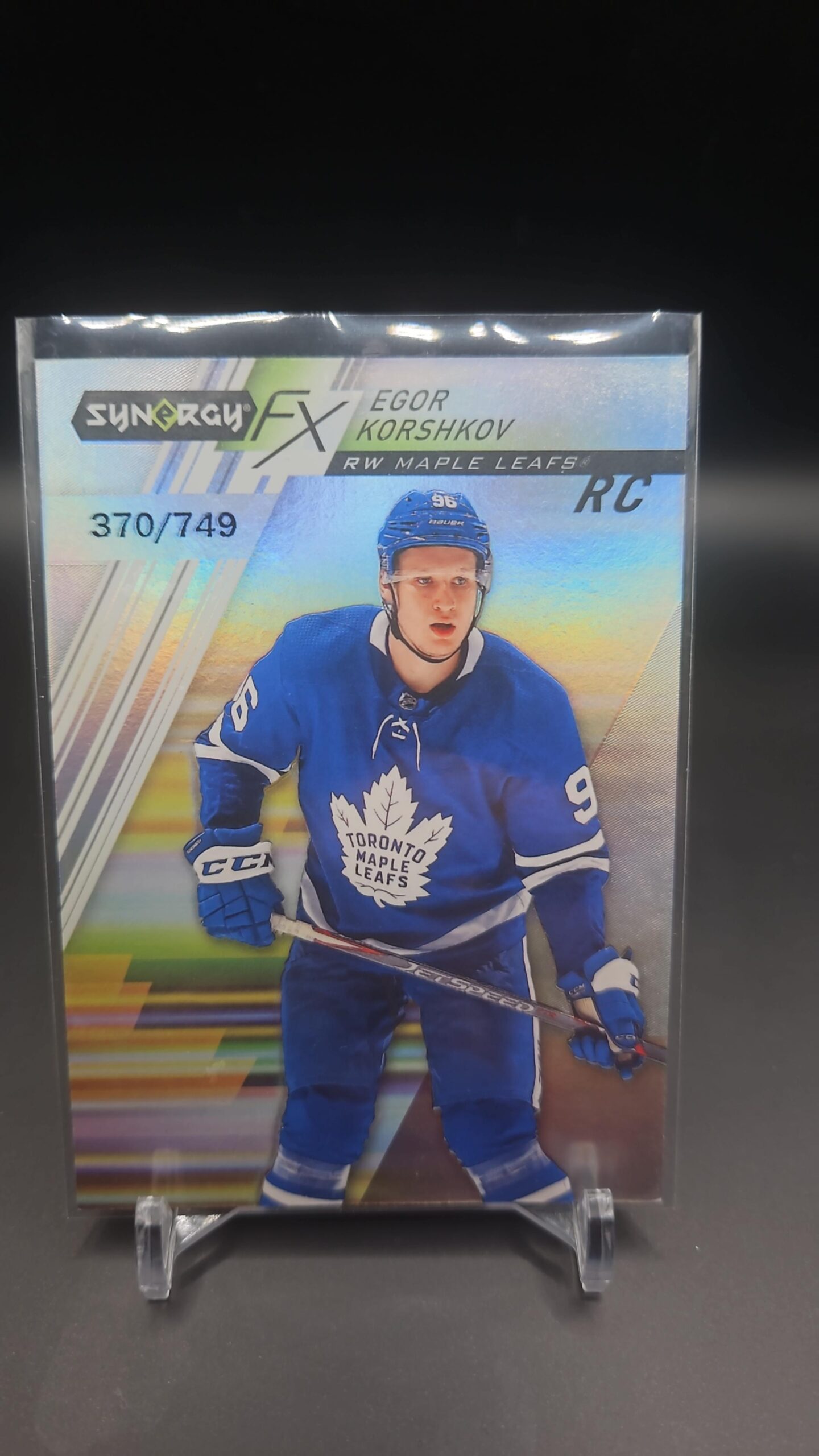 The 2020-21 Upper Deck Synergy FX Rookies Egor Korshkov /749 card is a rare, serial numbered rookie insert that stands out for Leafs collectors and Synergy set builders chasing limited-numbered rookie hits.